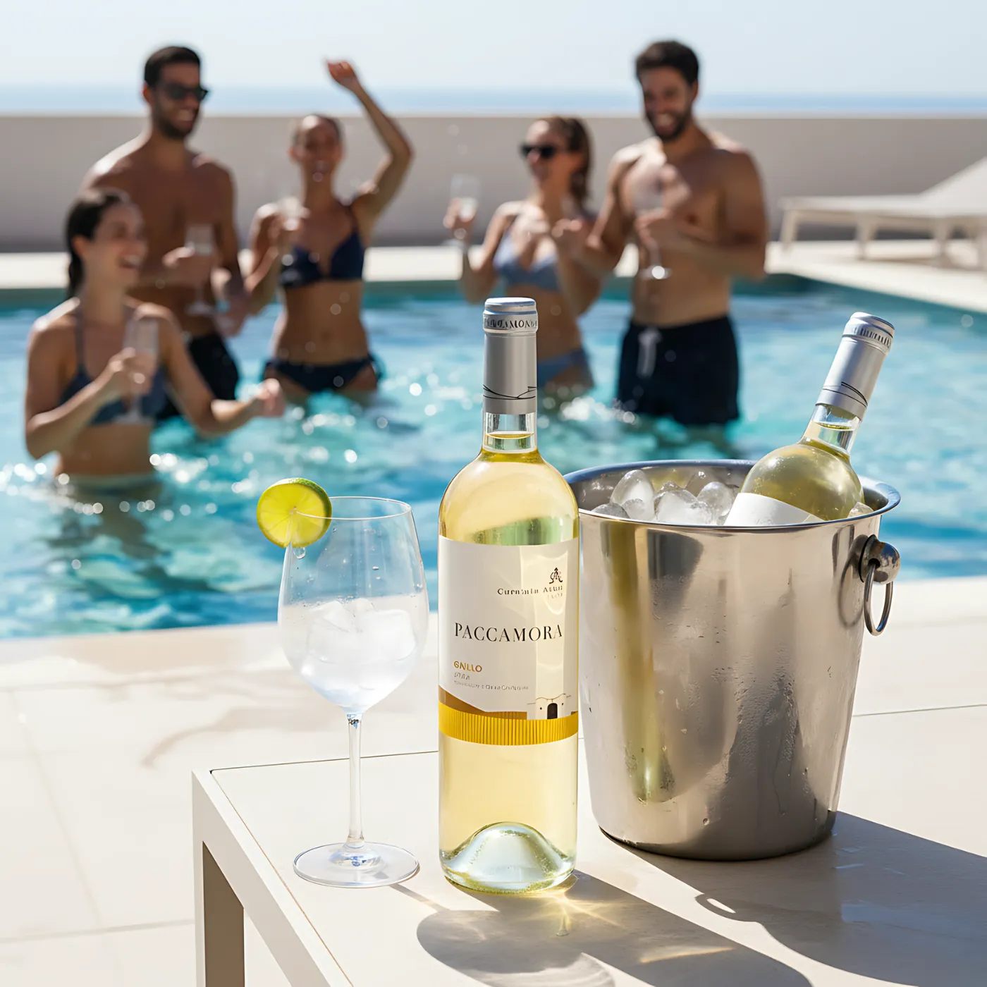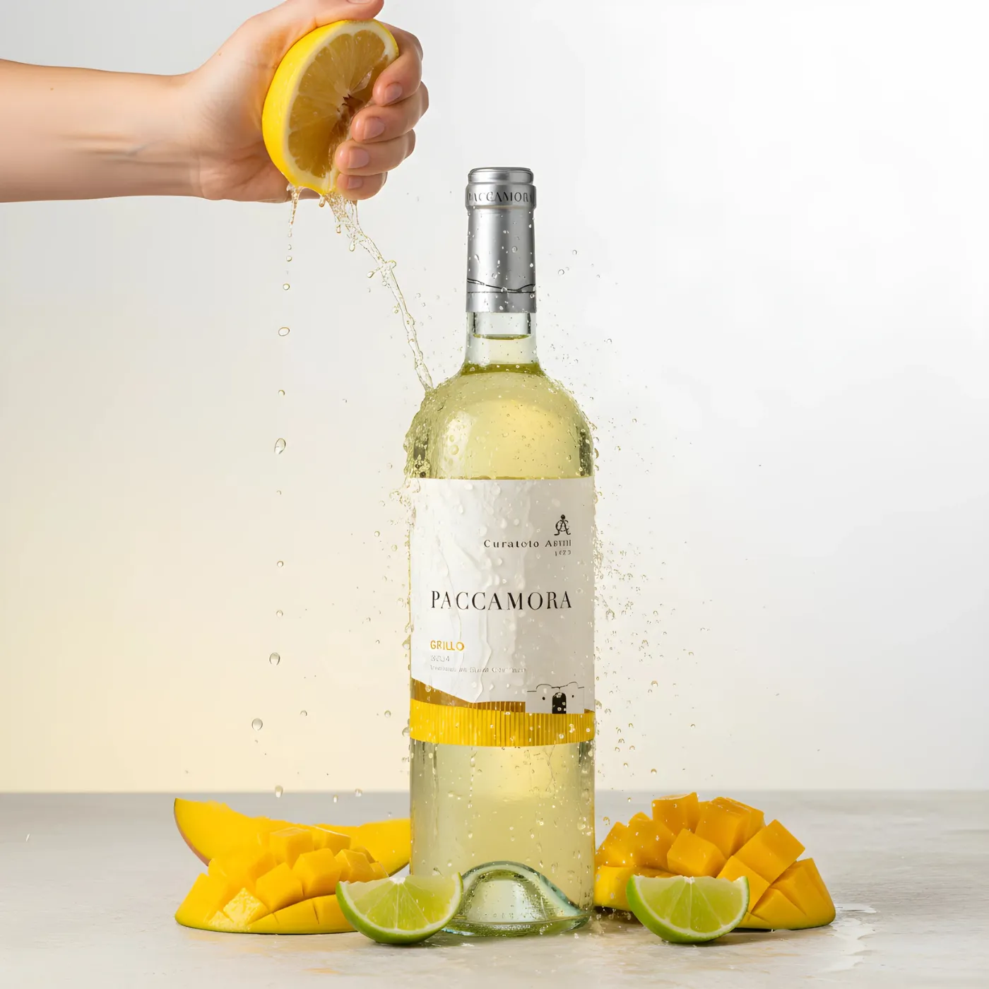 Paccamora Grillo Sicilia DOC e alb de soare luminos, cu pași ușori pe piatra fierbinte a insulei. Soiul ține bine frâul prospețimii chiar și în arșiță.