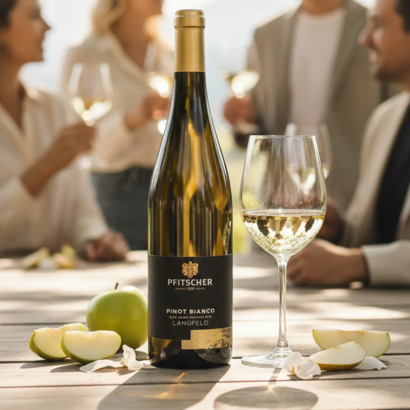 Tot Pfitscher, din Alto Adige, semnează acest Pinot Bianco Langfeld. Un alb limpede ca un râu de munte, galben-pai cu reflexe verzui.